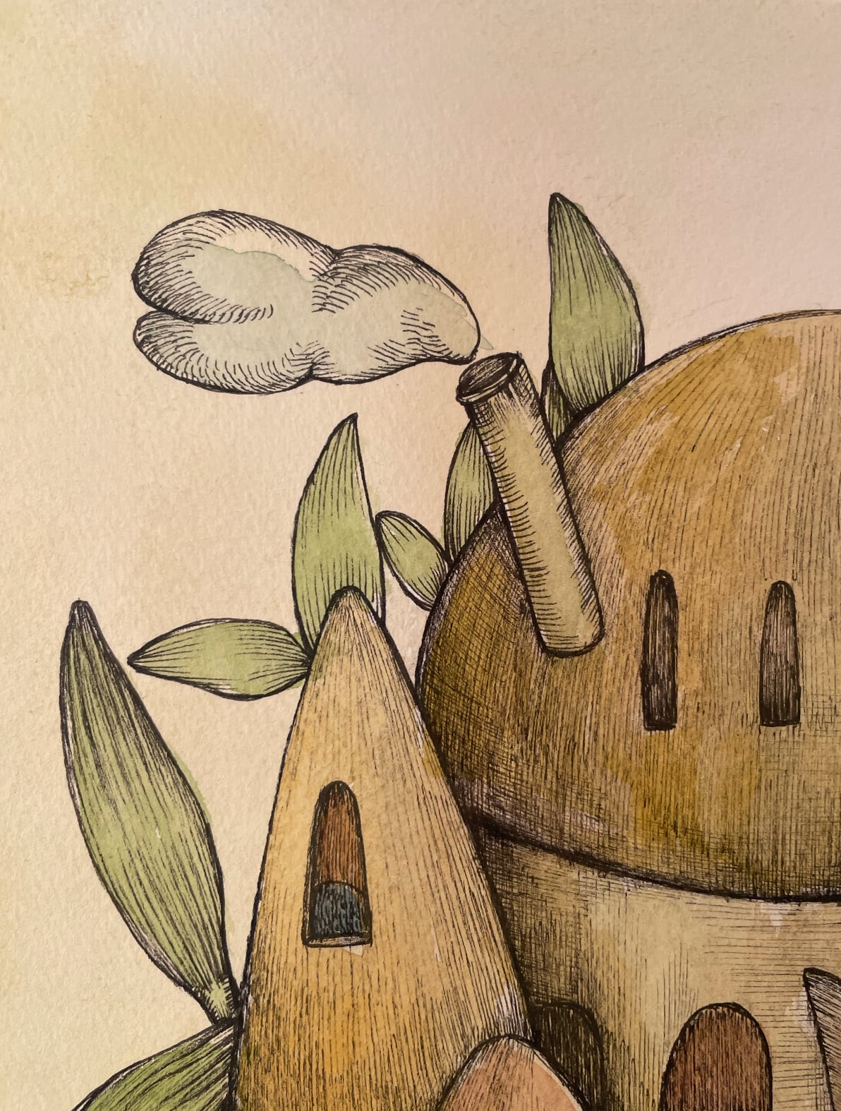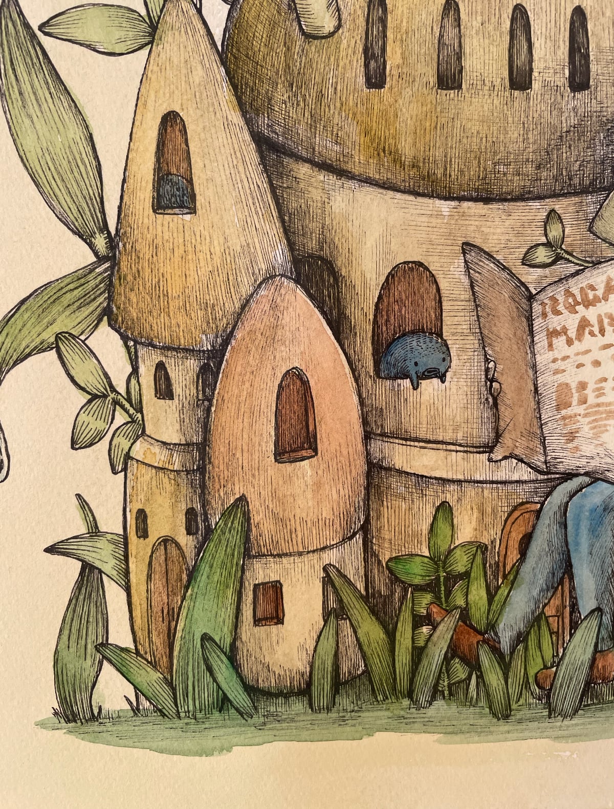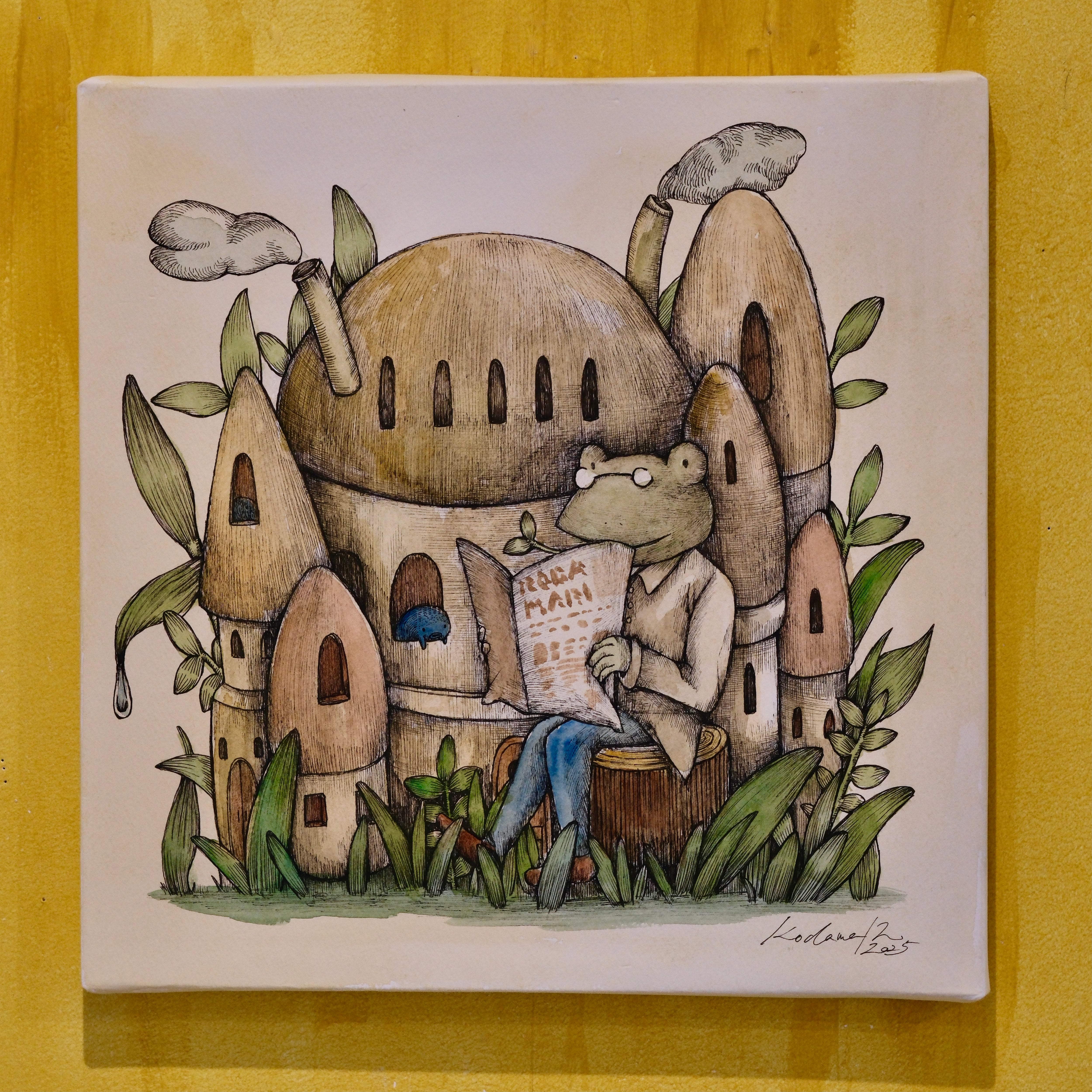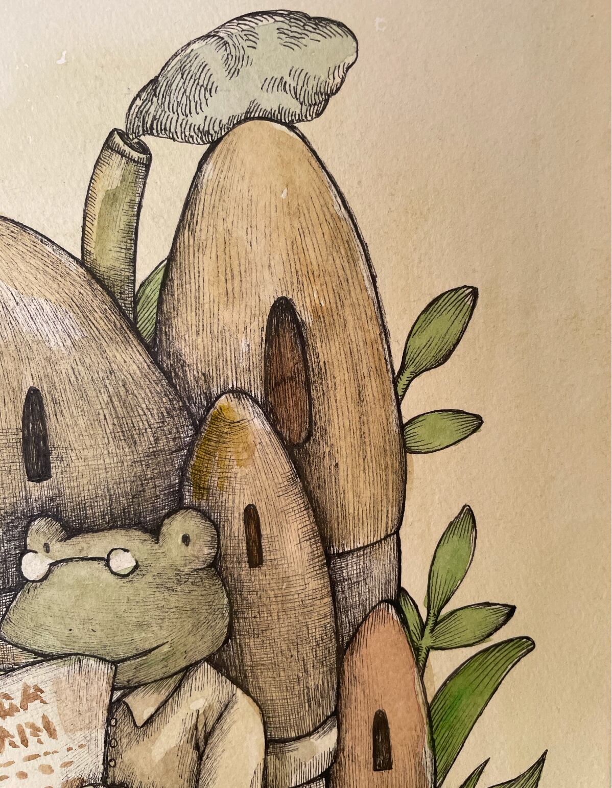 作品タイトル:かえるのおうち 帰る場所があります おたまじゃくしがまっている S4号(333mm×333mm) ペン、水彩 ※この商品はコダマリオリジナルの絵画です。 ※額無し