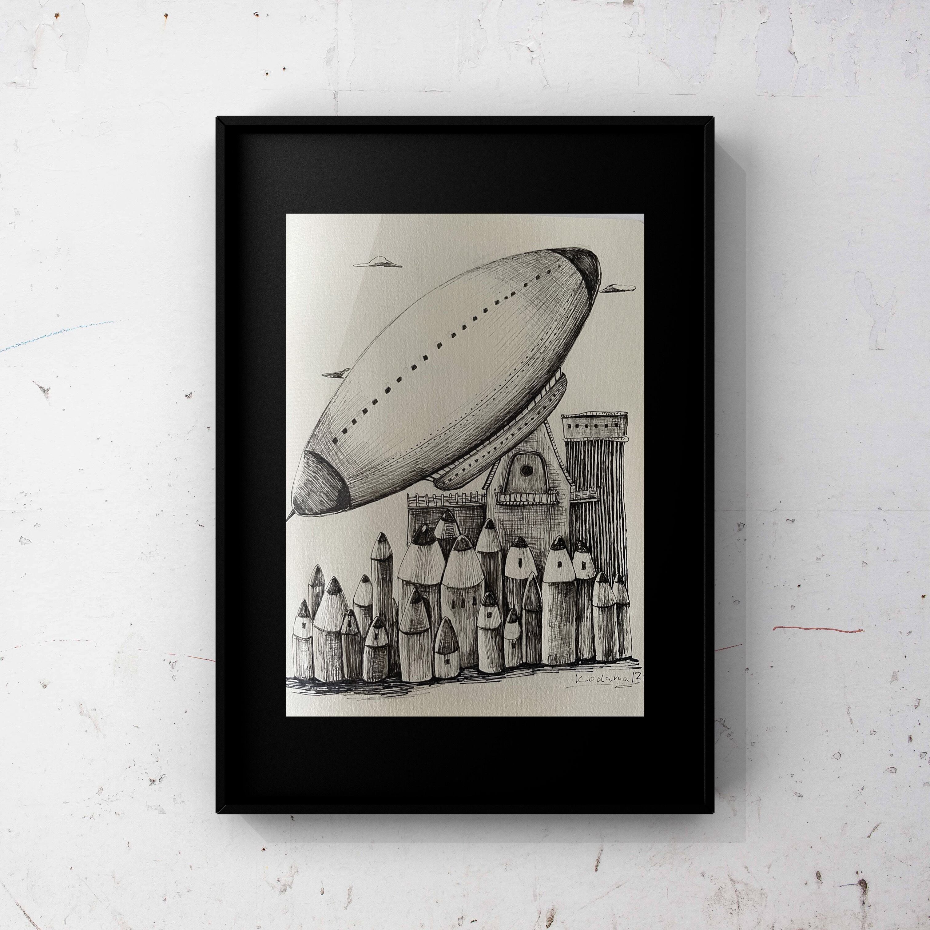 ペンで鉛筆の街を描きました。 数字の4をモチーフにしています。 60分のドローイング 額縁とマットは黒です 作品サイズ 10×14cm 額縁サイズ A4