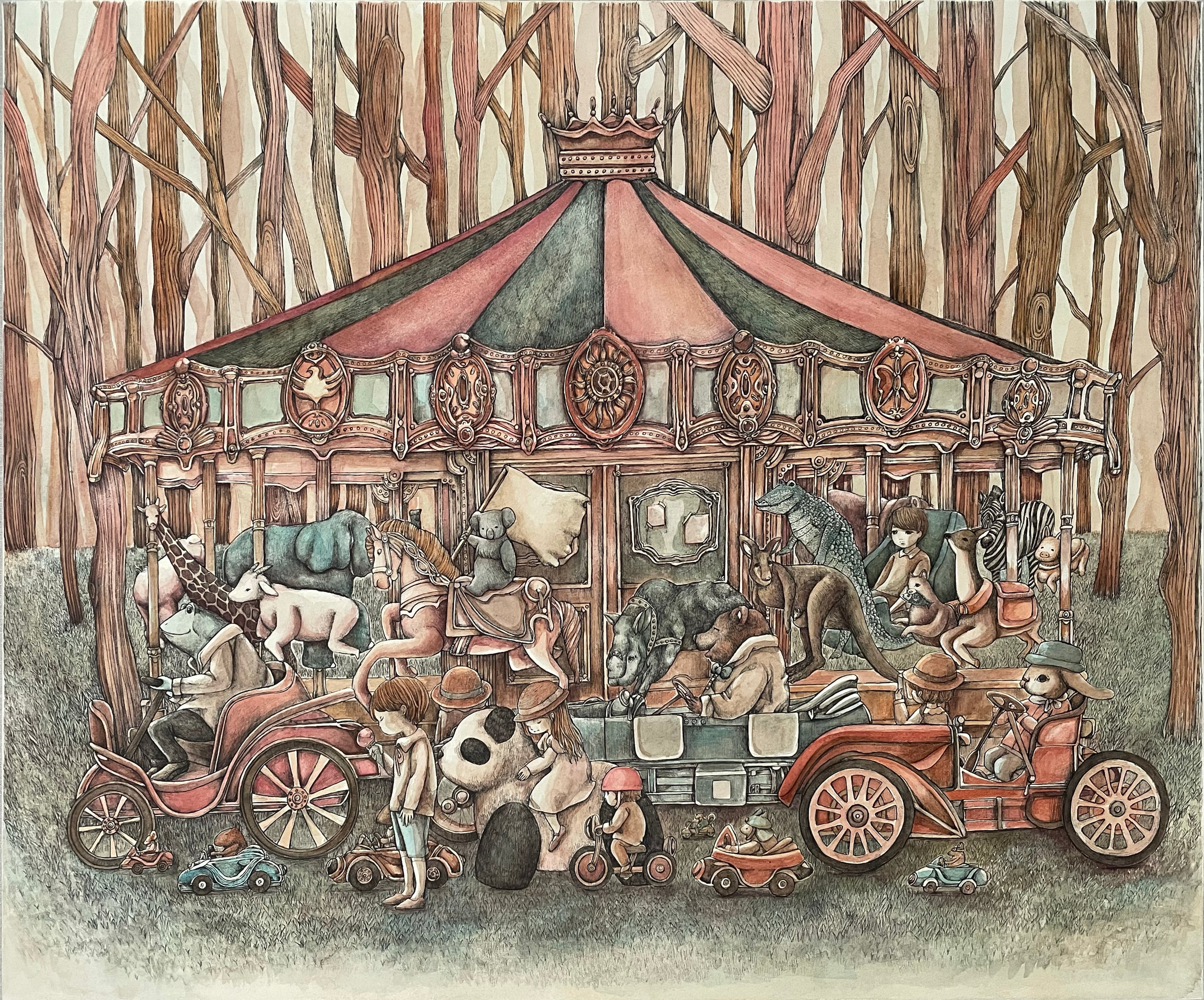メリーゴーランドに乗った時に感じた虚無感や空気感が忘れられなくて描きました。