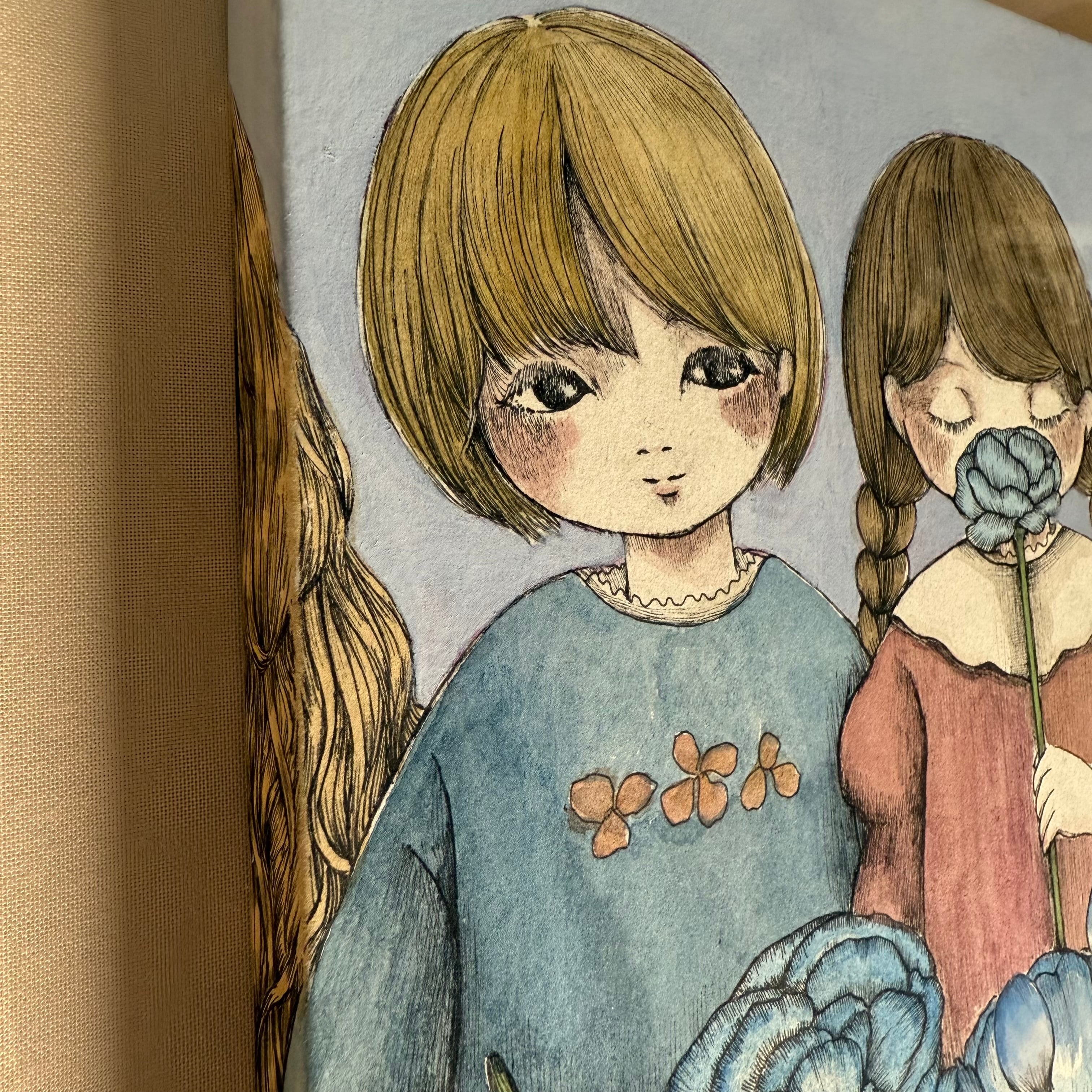 絵画「ともだち」は、心温まるアネモネがテーマの美しい作品です。青いアネモネの花言葉は「固い誓い」です。人生の旅で出会った人々が、みんな友達だったら人生がより豊かになると思い、友だちを大事にしていこうと誓い描きました。